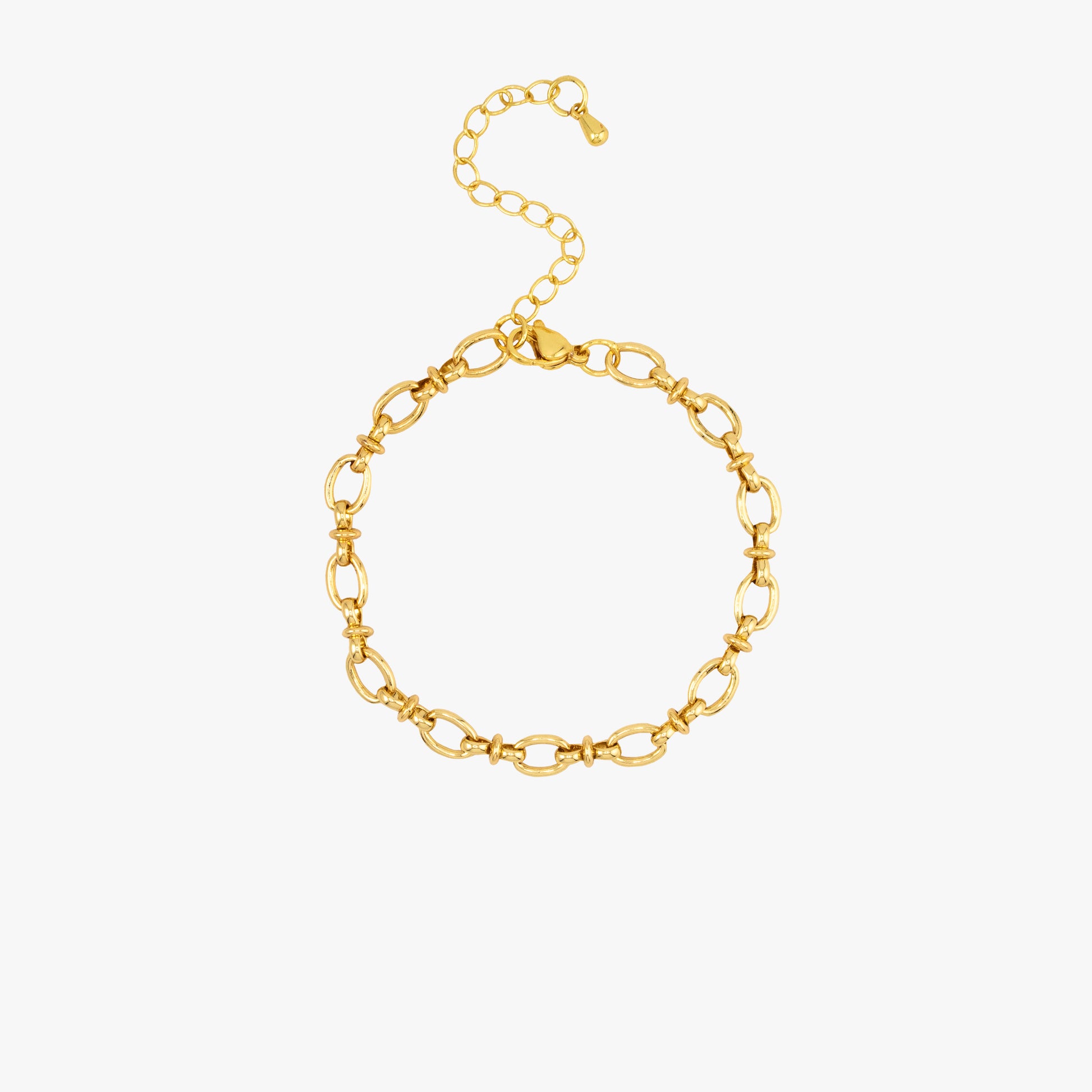 Cadena: Formada por eslabones ovalados con una longitud de 42 cm con un extensor de 4,5 cm, chapada en oro real de 18k.