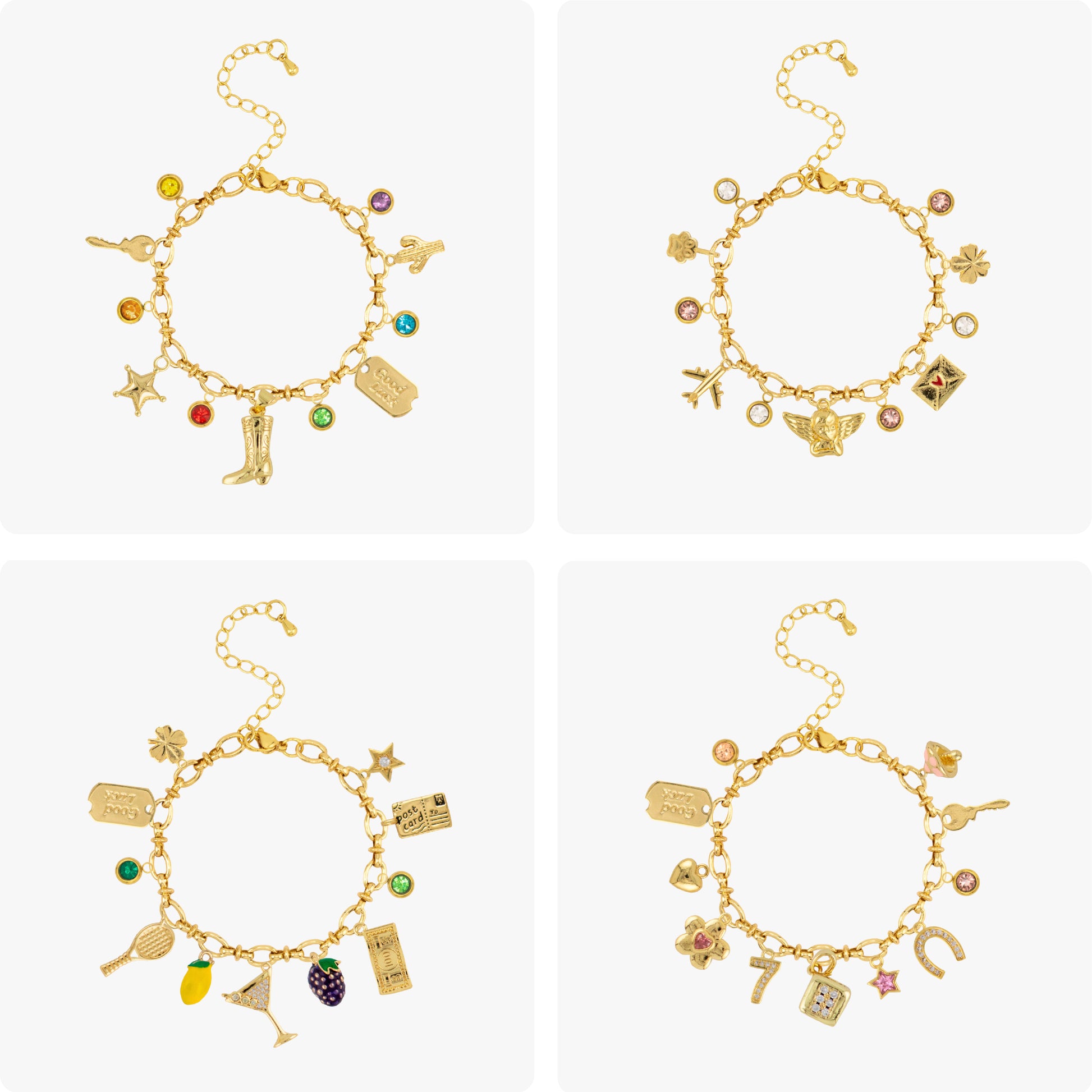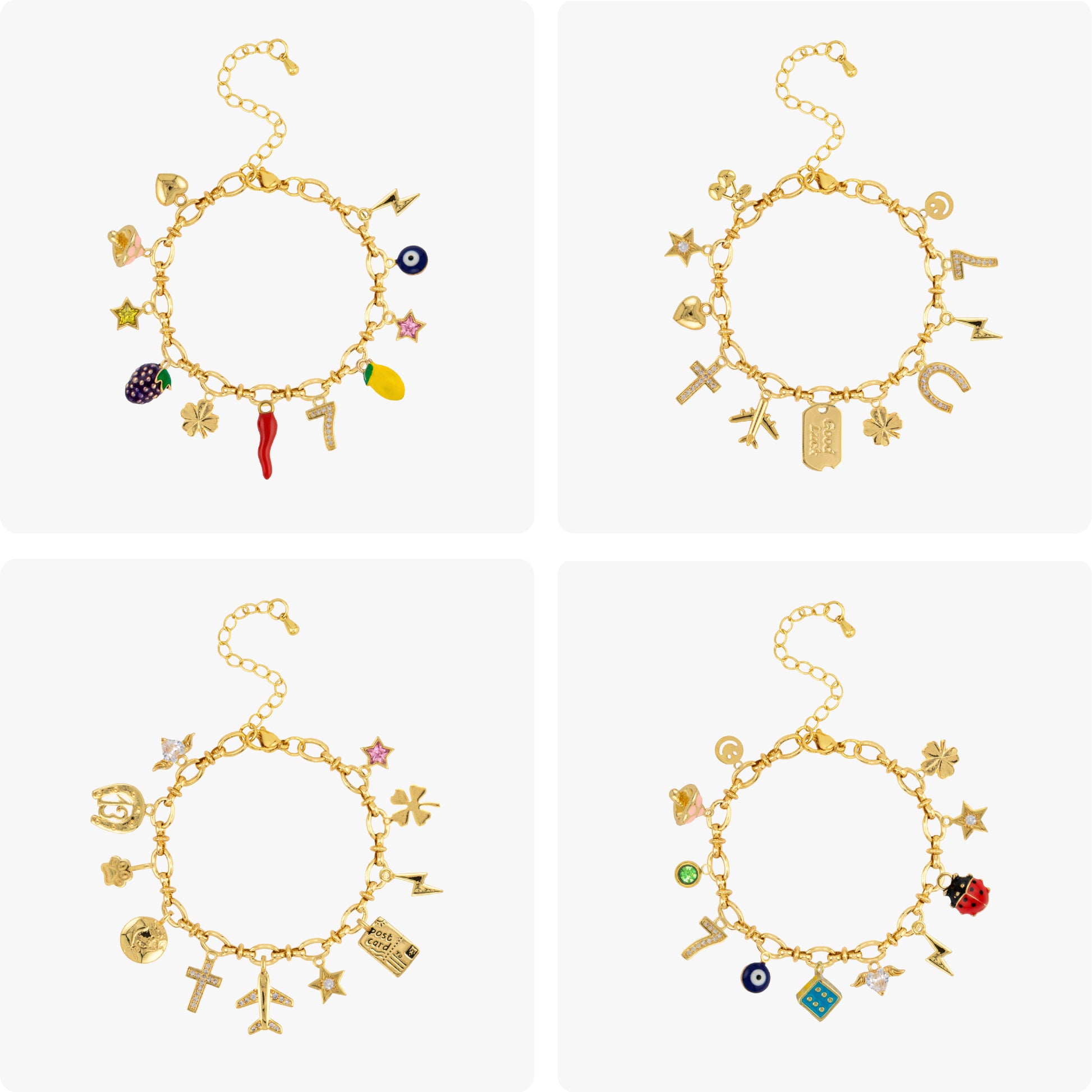 Charms: La mayoría de los charms están hechos de latón y chapados en oro de 18k, mientras que algunos pueden presentar otros materiales cuidadosamente seleccionados para mayor singularidad.